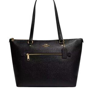 The Coach Gallery Tote Shoulder Bag in black is a large, rectangular-shaped bag with a zip closure and double handles. Made of canvas fabric with a pebbled finish, this designer bag features silver hardware accents and a black leather exterior. It is lined with canvas and fabric, with outer pockets to keep your belongings organized. Perfect for travel, parties, casual occasions, and business meetings, this stylish Coach bag adds a touch of sophistication to any outfit. The bag charm adds a fun accent to the classic design.
