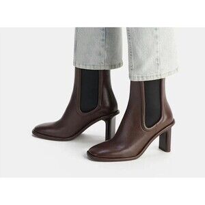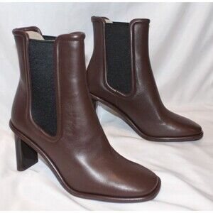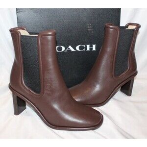 Elevate your style with these Coach Geneva brown leather heeled Chelsea boots. Perfect for any occasion, these boots feature a high block heel measuring at 3 inches and up, a maple color, and a medium calf width. The ankle shaft style and booties style add a touch of sophistication to your outfit.