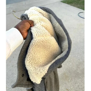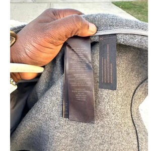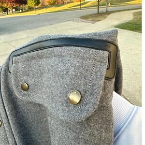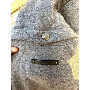 Preowned women’s coat in great condition. 80% wool and 100% cow leather. Color is gray, size is medium and pictures were taken indoors and outdoors to show true color.