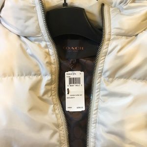 Coach women’s hooded puffer vest, size M, oyster color, never worn with tags ($298.00) and garment bag. Brand new condition. Shell 65% nylon, 35% polyester; lining 100% polyester; fill 70% white duck down, 30% white duck feather down weight 81g.