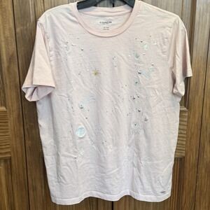 Authentic Coach women's graphic T-shirt in a soft blush pink, size large. Features a dreamy celestial constellation design with star, planet, and moon motifs in shimmering metallics and rhinestone accents. Lightweight 100% cotton with a classic crewneck fit. Gently pre-owned, in very good condition. Two small spots/stains noted- please see photos. May wash out.