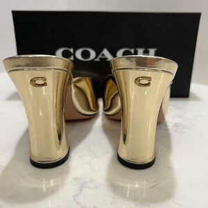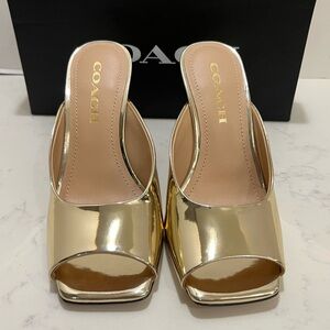 Elegant metallic gold mules with a chic design. Perfect for elevating any look.