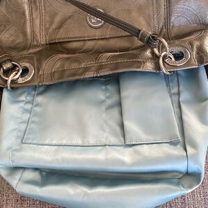 Color: Gray with a green under tone, blue lining and silver tone hardware