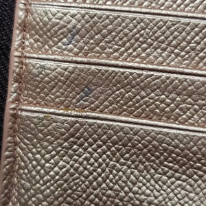 In good preloved condition, the color is hard to capture in photos. It's a rose gold pink color. The exterior his minor rubbing and the interior as a couple of small ink spots and the ID plastic piece is cracked on the side. The inside coin area is slightly discolored.