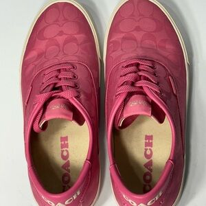 Step out in style with these vibrant pink sneakers from Coach. Perfect for adding a pop of color to any outfit.