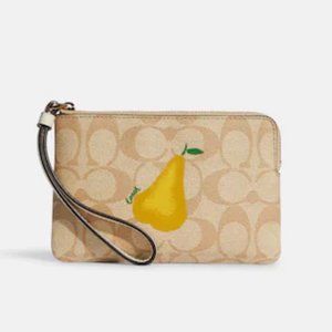 Coach Women's Signature Canvas Print with Pear Corner Zip Wristlet NWT Gold