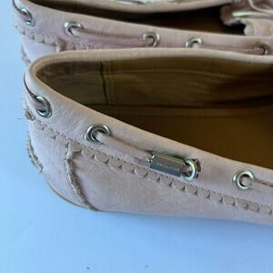 Coach Womens Size 10 B Baby Pink Olympia Tassel Leather Loafer Shoes Preppy. Slight darker in person than in picture. They have some discoloration on the toes, as well as on the soles. They is also some creasing and slight scuffing.