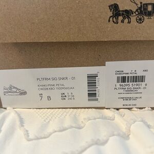 No longer available online. Stylish Coach sneakers with pink leather and brown accents. Perfect for everyday wear. Smoke free home. Used once. No damage. Excellent condition.