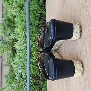 Coach Women's Sz 10 B Greer Black Leather Jute Wedge Gold Buckle Sandals