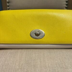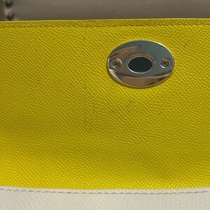 -Yellow wallet: can be worn as a cross body as well (chain not included). Some light pen marks on the inside cover.