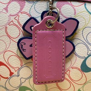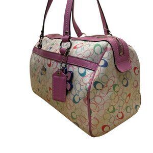 Multicolor Coach Signature "C" print with pink leather trim and accents. Spacious interior, secure zipper closure, and silver-toned hardware. Included flower bag charm.