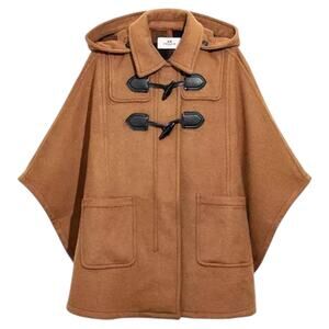 Style Tags: Coach coat, wool blend cape, hooded duffle coat, toggle coat, camel coat, brown outerwear, poncho coat, women's fashion, classic style, cozy chic, fall fashion, winter layering, size M/L, elegant outerwear, timeless design, relaxed fit, statement coat, versatile style, luxury fashion, new with tags
