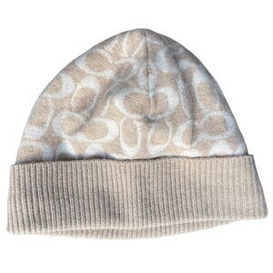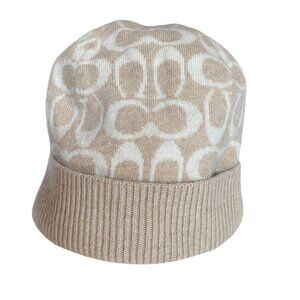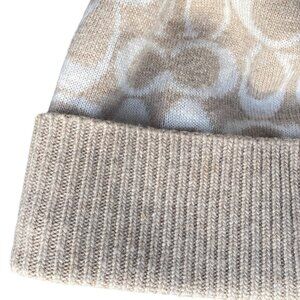 Coach Wool Cashmere Blend Jacquard Knit Signature Logo Cuffed Beanie Cream Tan-OS