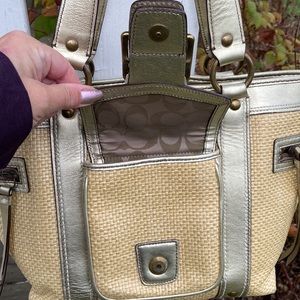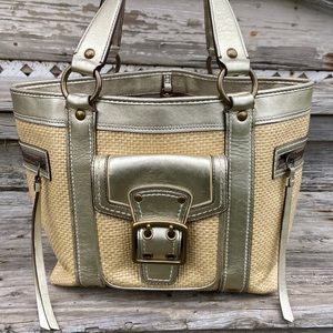 Coach Woven Straw and Metallic Leather Legacy Buckle Shoulder Bag M05K-113