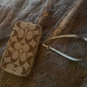 Zip pouch with C emblem print by Coach. Approx 3.5 x 5. Gold wrist strap and one external pocket. Good condition with some wear on metallic trim.