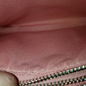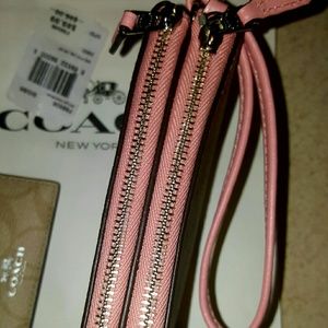 Signature coated canvas Wristlet. light khaki and blush pink with a silver coach emblem. 2 multifunction pocket Zip closure, fabric lining Wrist strap attached Approx. 6 1/4 (L) x 4 (H). An iphone plus does not fit in it. Perfect match for the card holder I have listed. (((Sold)))