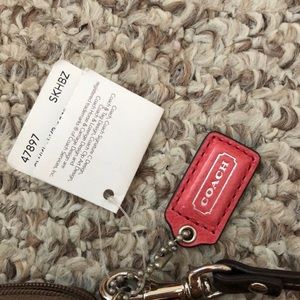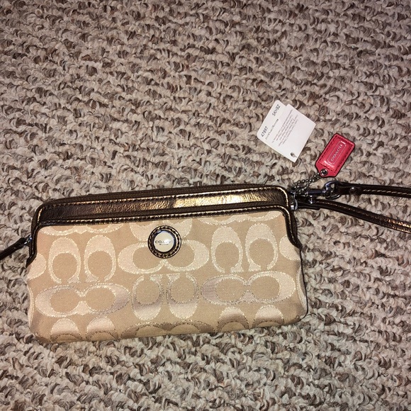 Two zippered pockets. Tons of pockets for ids, cards, cash and checkbook. Never used. New with tags. Comes with care instructions. Tannish/ gold. Khaki/brown. Has pocket on back. Wrist strap attached.