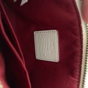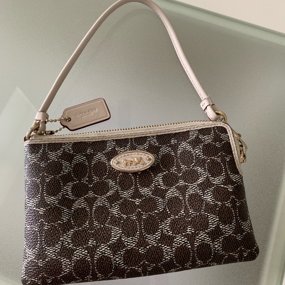 This small Coach wristlet is super convenient to hold your necessities! It is 4” tall and 6 1/2” wide.