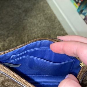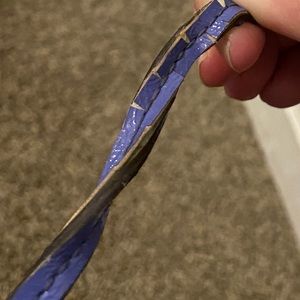 Coach wristlet with periwinkle detail. Used a few times but underside of wristlet strap is cracking, as seen in 3rd photo. Not noticeable unless looking underneath for it.