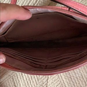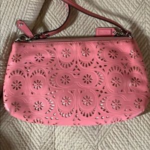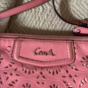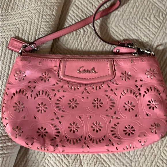 Pink Coach wristlet. 6 inches tall by 10 inches across Handle, tag and zipper closure. Inside is stained as shown
