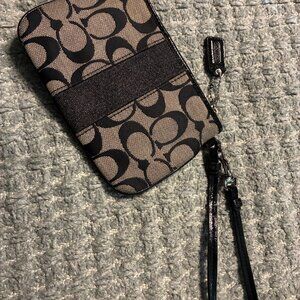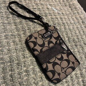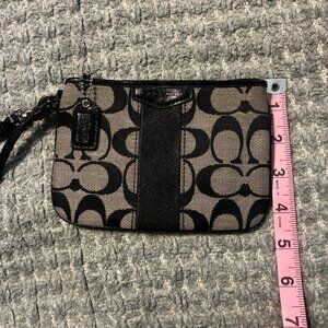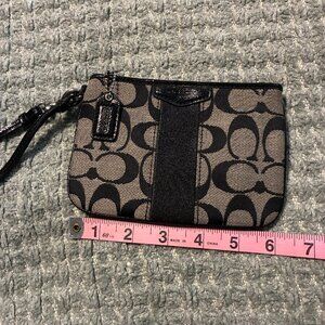 Coach's signature logo'd canvas with patent leather accents. Perfect for keys, lipgloss or any other small item! Two internal slip pockets for credit cards & a driver's license. Dog-leash clasp that can be used to secure in a larger bag or belt loop for a hands-free option.