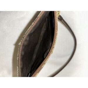 The Coach Wristlet in brown leather with a logo pattern is a vintage accessory that exudes classic style. This small rectangular wristlet features a zip closure, gold tone hardware accents, and a fabric lining. The exterior is crafted from a combination of jacquard, boucle, and leather materials, making it a versatile and luxurious addition to any woman's wardrobe.
