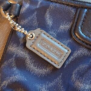 This Coach wristlet is in Excellent Preowned Condition - No flaws. Navy and Black with Gray Logo Pattern. Inside Pocket. Navy Lining. Gray Coach Tag.