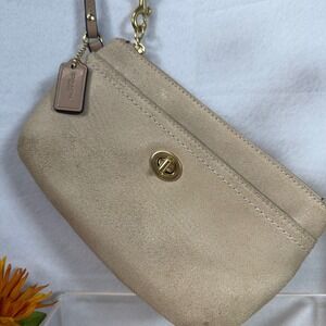 Coach Wristlet Tan Gold Metallic Leather Turnlock Pouch Small Purse Clutch