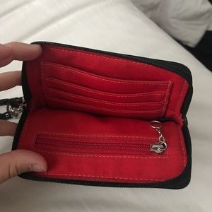 Coach authentic wristlet wallet. It holds up to 4 cards and has a zip coin compartment inside and one outer pocket. It is in great condition with no noticeable wear!