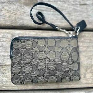 Coach wristlet wallet. “C” pattern. Wrist strap. Pretty used condition. Metal coach tag is scratched. Serial