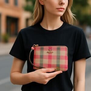 Coach corner zip wristlet and UV umbrella set with plaid print in gold and pink multi.