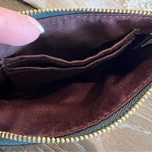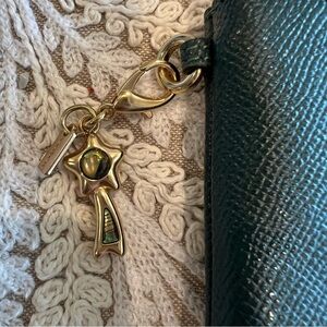 Its compact size and attached wrist strap make it perfect for carrying essentials with style.