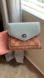 This Coach wallet combines a sophisticated blue flap with a classic brown monogram pattern, offering a stylish and compact accessory for your essentials.