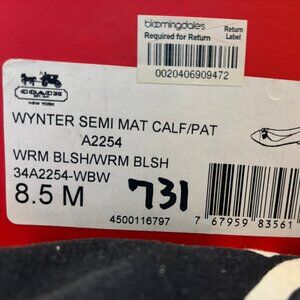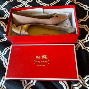 Coach "Wynter" flats in blush leather, patent toe caps, gold bows, size 8.5