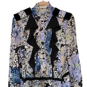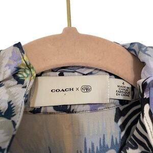 Coach X Kaffe Fassett Print Floral Black Lavender size 4 Asymmetric Hem in excellent condition with Ribbon trim, velvet bows and gorgeous buttons. Measurements laying flat chest 18 inches across and waist 17 inches across and length 42 inches long at shortest and 56 at longest point