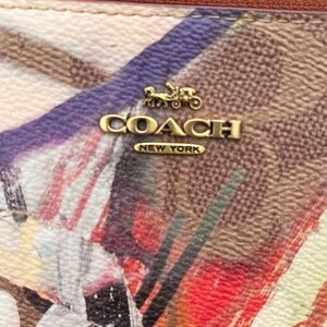 Artistic design with vibrant colors. Includes detachable strap. Perfect for everyday style. This authentic Coach bag can be used as a clutch, wristlet or crossbody. I love the middle compartment that holds your phone. It fits an iPhone 13. One inside section has leather slip pockets on each side to hold your cards.