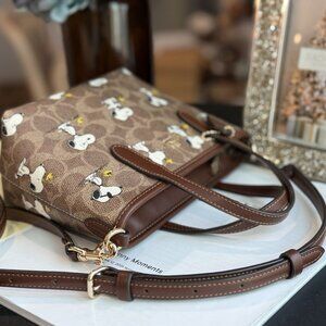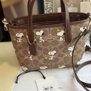 Coach X Peanuts City Mini Tote Bag In Signature Canvas With Snoopy Print Color: Im/Tan/Brown Multi Signature coated canvas | Trim partially made with recycled leather fiber layer | Inside multifunction pocket | Zip-top closure, fabric lining | Handles with 3 1/4" drop I strap with 22 1/4" drop for shoulder or crossbody wear | 6" (L) × 5 1/2" (H) × 3 1/2" ////////