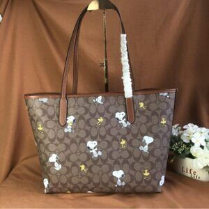 NWT Coach X Peanuts City Tote In Signature Canvas With Snoopy Woodstock Print