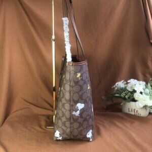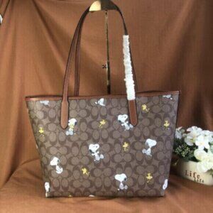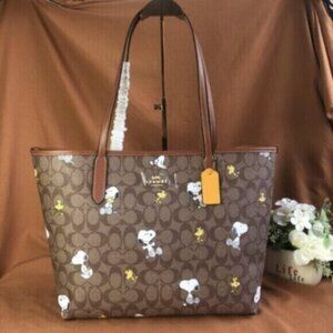 Coach X Peanuts City Tote In Signature Canvas With Snoopy Woodstock Print