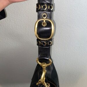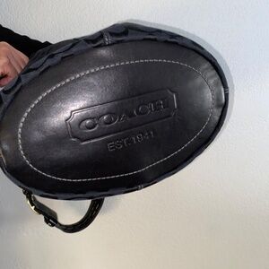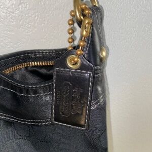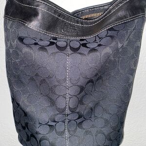 Vintage black on black on black Coach bleeker duffle . Black canvas C print material with Smooth black leather with a black satin inside . Hardware is brass tone not gold tone . Bottom of purse shows little to no wear . For the age of this purse i'd say its near mint . If your a collector or if this is your favorite style grab this cause the black is harder to find going on my own research in this condition . No rips no stains no smells .. perfect . Measurements are 15" W x 13" H x 6.5" D