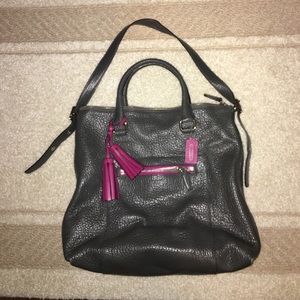 Lightly Used/In Good Condition XL Coach Tote bag. Color is dark grey with fuchsia accents. Open interior with three inside side pockets and one outside pocket. Both short and long straps for wrist or shoulder use. Zipper to fully close.