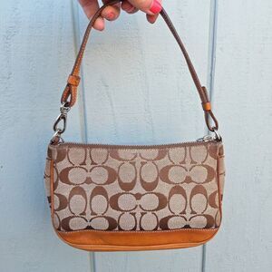 2000s vintage British tan/auburny/vachetta? leather bottom, trim, zipper pull, strap and Coach tag. The jaquard canvas in a lighter tan, almost beige with Coach's Signature C pattern beautifully contrasting with everything. Zip closure. Strap detaches on one end to wear this as a wristlet. Lined interior with a slip pocket.
