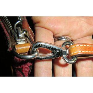 This Coach Y2K Hampton bag features a red canvas body with tan leather accents and signature jacquard pattern. Its demi baguette shape is perfect for everyday use or a stylish night out. A must-have for vintage fashion enthusiasts.