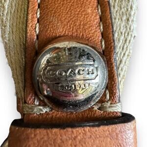 Adorable Coach Y2K Hamptons Goldish-Yellow Toned Nylon Canvas & Leather Trim Mini Tote /Shoulder Bag. The bag shows some wear to the back top and the bottom edges. The leather has patina’d beautifully and the interior pink signature C lining is in very good condition with some minor marks to the top edges. This is the PERFECT beach bag or vacation tote. It holds just enough for essentials that don’t bare going into a more higher quality bag, while still being a fabulous look on your shoulder or arm. There is one exterior zipper pocket on the front of the bag while the main compartment has a zipper as well along with a interior zipper pocket behind the storypatch and two small wall pockets on the opposite wall of the bag.