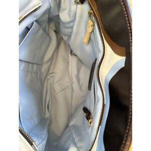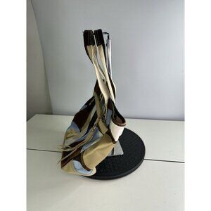 The Coach Y2K Hamptons Weekend Scarf Print Tote in brass hardware with multicolor brown/blue exterior is a stylish and spacious handbag perfect for weekend getaways. This rectangle-shaped tote features double leather handles, a zip closure, and a multicolor lining. The satin and leather exterior with a decorative scarf print adds a touch of luxury, while the brass hardware gives it a chic and timeless look. The bag also comes with a charming accessory, making it a perfect choice for fashion-conscious women on the go.