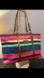 Vibrant striped tote with leather handles. Features Coach logo and charm. Perfect for everyday use.