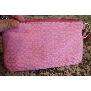 BRAND Coach CLOSURE zipped MATERIAL jacquard/leather HARDWARE silver COLOR pink INTERIOR none DEMINSION strap:6"