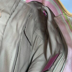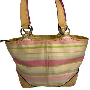 This Coach Y2K Hampton handbag features pastel stripes and Vachetta leather, perfect for adding a pop of color to any outfit. The bag includes a hang tag, combining style and functionality for everyday use.