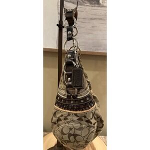 The Coach Y2K Vintage Signature Jaquard & Leather Crescent Hobo 10611 in Brown & Tan is a stylish and medium-sized handbag perfect for women. Made from a combination of canvas and leather with brass hardware, this hobo bag features a unique crescent shape and a zip closure for security. The shoulder strap adds convenience and comfort while the brown and tan exterior color with the brand's signature logo pattern adds a touch of vintage charm. Perfect for everyday use or special occasions, this Coach bag is a timeless piece that embodies both fashion and functionality. This is such a special unique vintage bag. It is looks like it's missing the zipper leather pool that does have the ring.