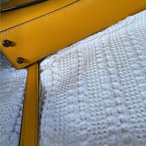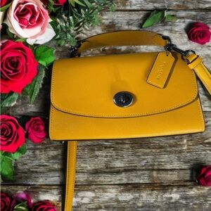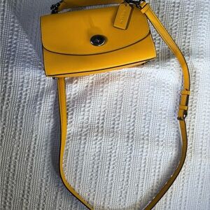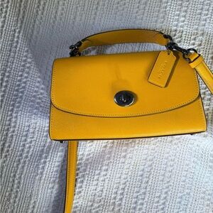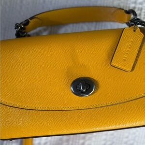 This Coach crossbody bag in a striking yellow hue features a sleek, structured design with a sophisticated flap closure. Crafted from smooth leather, it offers a vibrant pop of color, making it a standout accessory for any ensemble.